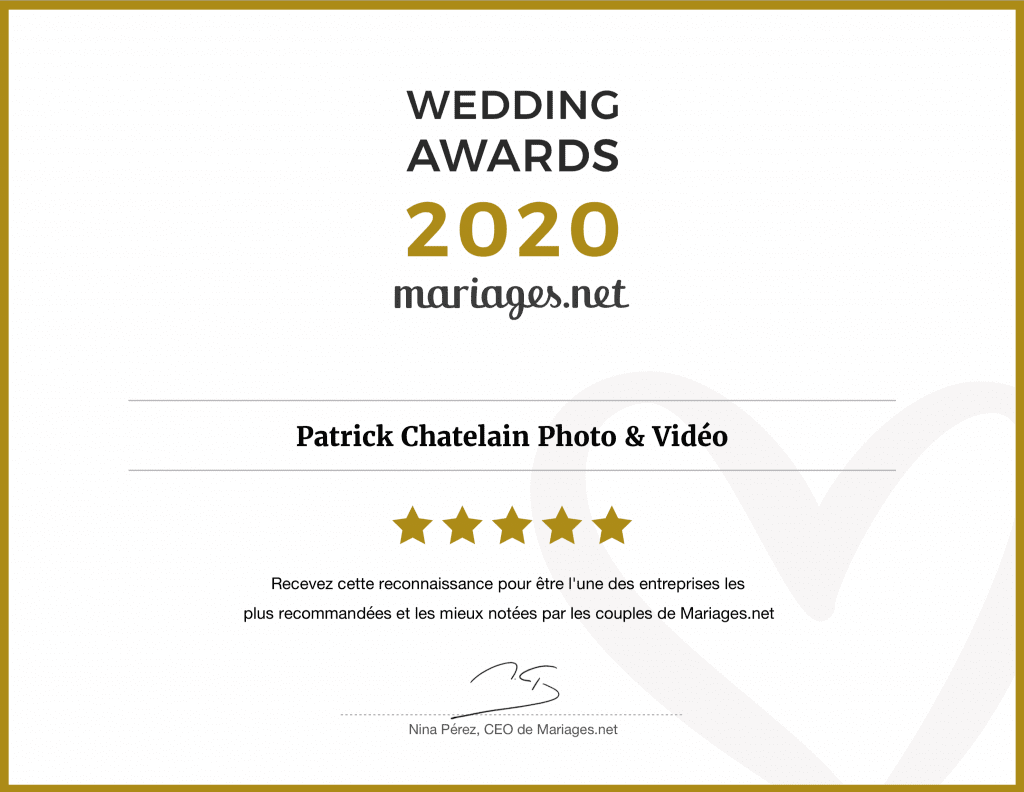 Le prix le plus prestigieux du secteur nuptial Mariages.net célèbre la 6e édition des prestigieux Wedding Awards, auxquels participent plus de 42 000 entreprises inscrites. Cette édition revêt une importance particulière car elle représente un grand soutien pour les professionnels du secteur qui doivent faire face à la plus difficile saison des mariages que nous ayons connue jusqu’à présent en raison du Covid-19. Les Wedding Awards sont reconnu car il s’agit des seuls prix de l’industrie du mariage basés sur les milliers d’opinions de couples mariés. Ce prix reconnaît Patrick Chatelain Photo + Vidéo, dans la catégorie Photo, comme l’un des professionnels les plus recommandés par les couples qui se sont mariés en 2019.